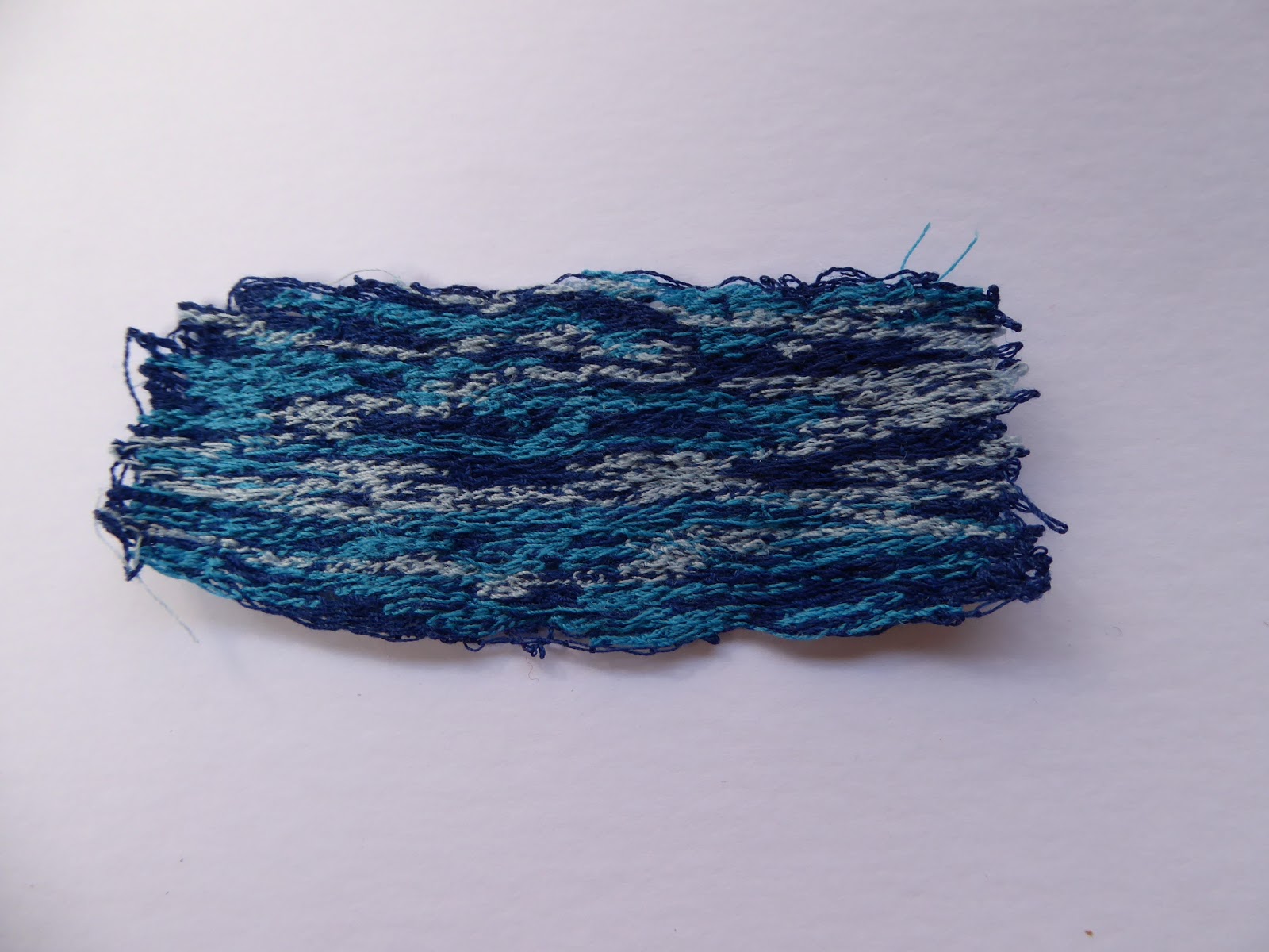 I stitched this solid piece of machine embroidery on a piece of soluble fabric to mimic the very bottom 'flood' strip in my design, which I think it does adequately, however the remainder of the wallhanging really needs to be more 'ethereal' and flexible so I would not choose to use this.